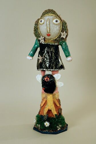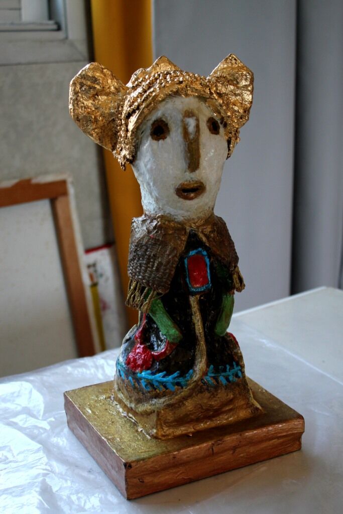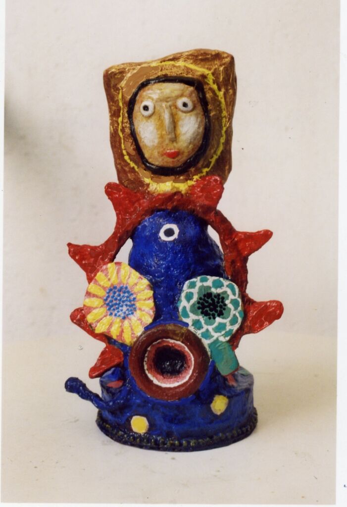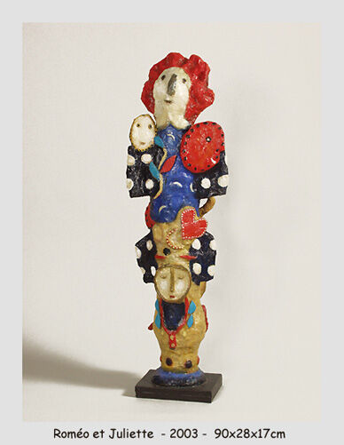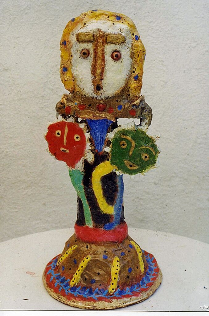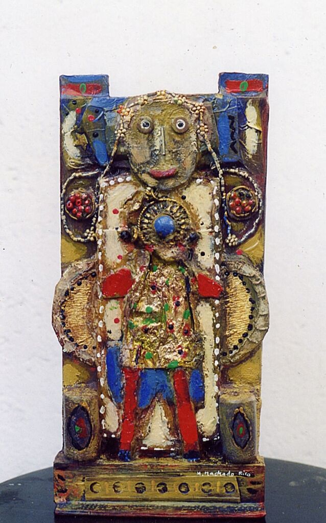 H. Machado entraîne le visiteur à la rencontre d’une tribu tranquille, où depuis longtemps les fumées du calumet de la paix ont transcendé toutes les humeurs guerrières, expansionnistes et intolérantes de tant d’autres populations avoisinantes et lointaines. Une série d’idoles tranquilles enchantent le regard. Ici, pas de génies sanguinaires, de chapelets de têtes coupées ou de longues cohortes d’éviscérés. Non tous ces personnages fixés à jamais bien que l’on ne sache jamais, regardent devant eux, l’œil un peu fixe. Ils me donnent l’impression qu’occupés à quelque tâches coutumières, tout d’un coup on leur a demandé de poser pour la photo et alors résultat : les voilà tout raides devant nous. Mais je suis presque certain que dès que l’on tourne le dos, on les retrouve assis sur le sol en train de parler de la pluie et du beau temps, tout en échangeant des réflexions sur les visiteurs du jour. Pour l’instant, ils posent devant nous, JC Caire
